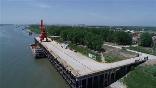 新堤综合码头位于长江中游新堤水道出口和石头关水道进口段左岸,共有4个3000吨级泊位,年设计吞吐量195万吨。其中已建成2个泊位,此次投入试运行的是1#泊位,2#泊位计划今年11月试运行。在其下游50米,还有2个散货泊位正加紧建设。